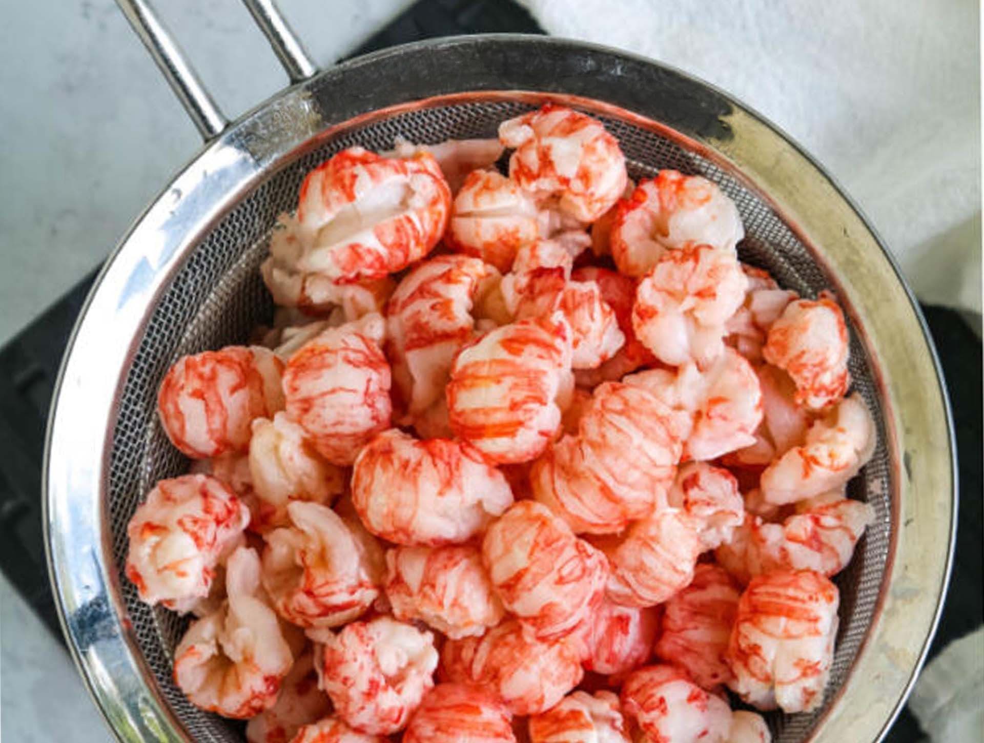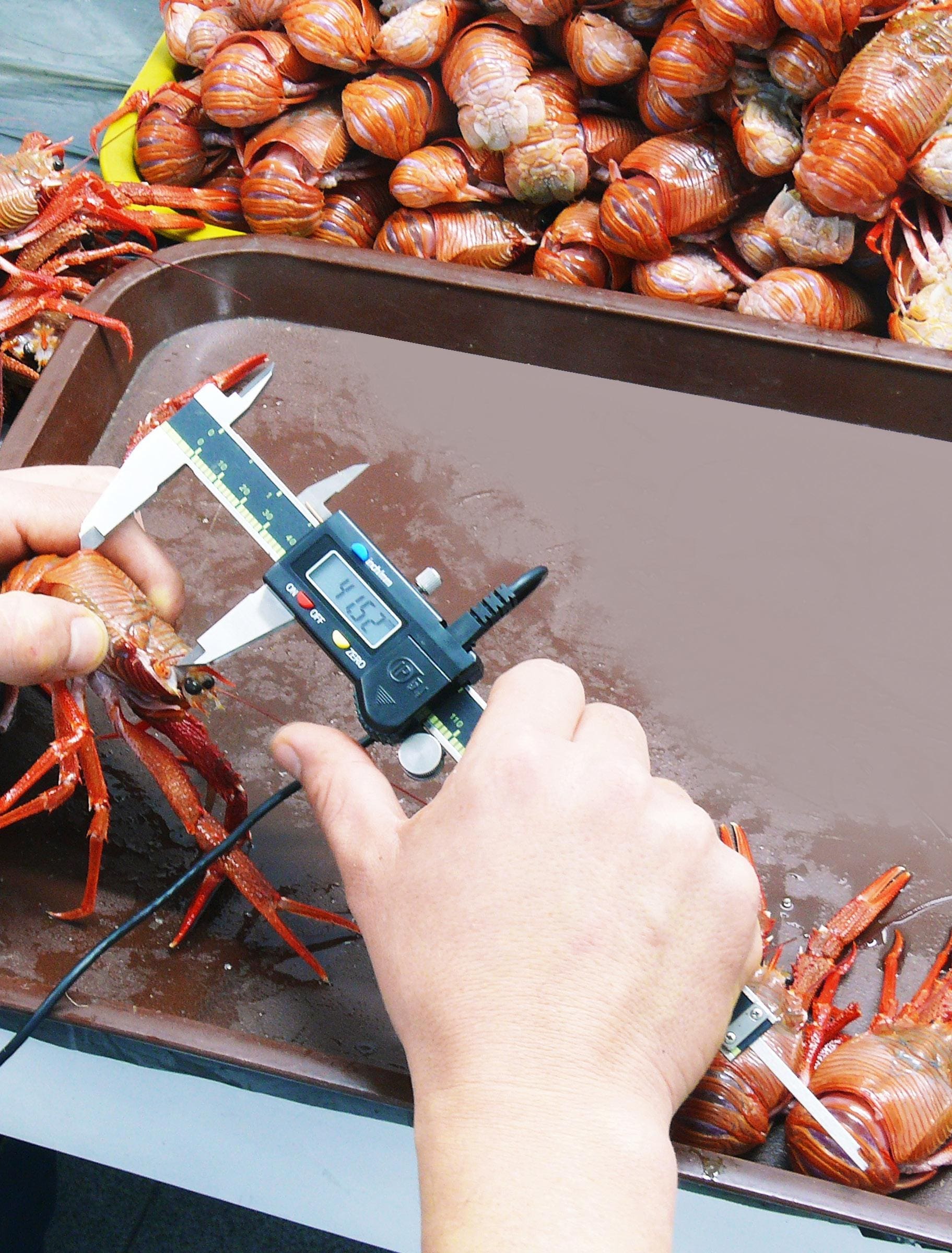 Cervimunida johni. Comúnmente llamado langostino amarillo o langostino lobster. Conocido por su colorida cáscara anaranjada y violeta, tornánose amarilla hacia el extremo. Se distribuye preferentemente entre las regiones III a IV y V a VIII. Se puede extraer solo de Abril a Diciembre. Habita en profundidades que fluctúan los 150 y 500 metros. *Es una especie en sí pequeña. Su talla (cefalotórax) en edad adulta es de 3,3 cm para los machos y 2,8cm para las hembras, por lo que su cola no es grande. Las colas peladas pueden llegar a medir 1,5cm aprox.