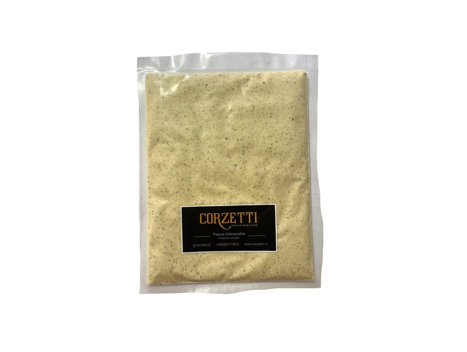 Ingredientes 100% naturales, sin aditivos ni conservantes: Crema de leche, nueces, ajo chilote asado, queso parmesano rallado, sal, pimienta.
