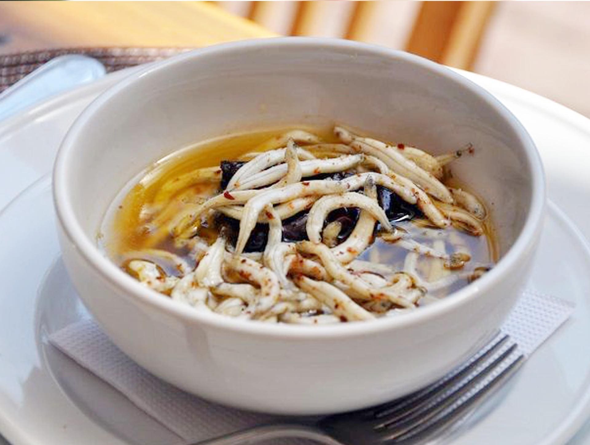 Galaxias maculatus. También conocido como Angulas, Coltrao o whitebait. Pez nativo de Chile de cuerpo anguiloforme carente de escamas, que mide entre 7 a 10 cm. Vive en masas de agua dulce, en estuarios y se alimenta de plancton.